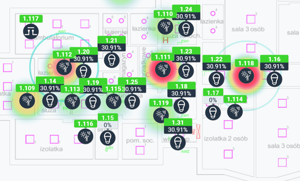 Przykładowy plan obiektu. Kolor wokół sensorów pokazuje intensywność ruchu. Pulsujące zielone okręgi to chwilowe naruszenie. Poziom jasności opraw wyświetlany w czasie rzeczywistym.