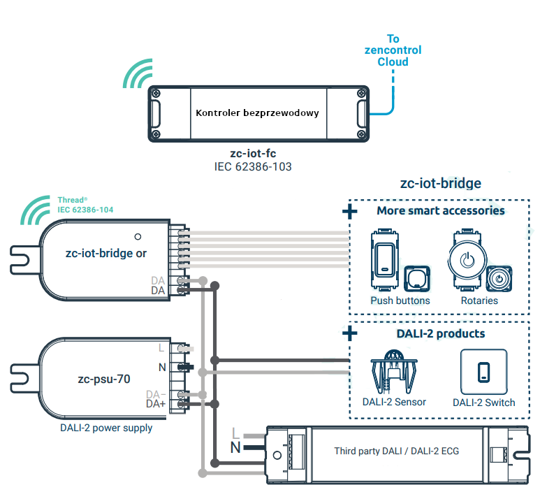 - Współpracuje z kontrolerem DALI-2 zc-iot-fc
