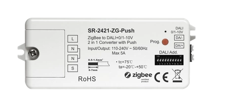 SR-2421-ZG-Push to interfejs Zigbee DALI oraz interfejs Zigbee 0-10V/1-10V, który odbiera sygnał Zigbee i może być sterowany za pomocą uniwersalnych bramek Zigbee oraz pilotów Zigbee. Ten interfejs Zigbee DALI został zaprojektowany na bazie Zigbee 3.0, co zapewnia wysoką interoperacyjność z systemami Zigbee innych producentów. Kontroler konwertuje sygnał bezprzewodowy na DALI oraz 0-10V/1-10V.