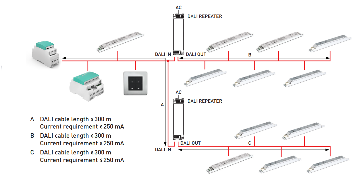 • Maksymalna liczba urządzeń DALI w całej sieci jest ograniczona do 64; urządzenia można dowolnie podzielić na podrzędne obwody