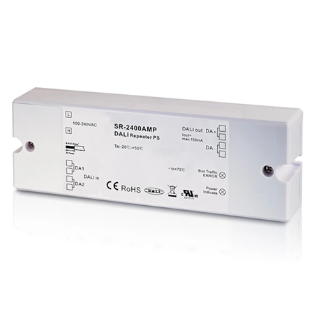 SR-2400AMP to uniwersalny repeater sygnału DALI z wbudowanym zasilaczem magistrali, który może wydłużyć odległość przesyłania sygnału DALI w obwodzie DALI. Dzięki wbudowanemu zasilaniu magistrali DALI, repeater DALI umożliwia utworzenie podrzędnego obwodu DALI z głównego obwodu DALI bez potrzeby stosowania dodatkowego zasilacza DALI.