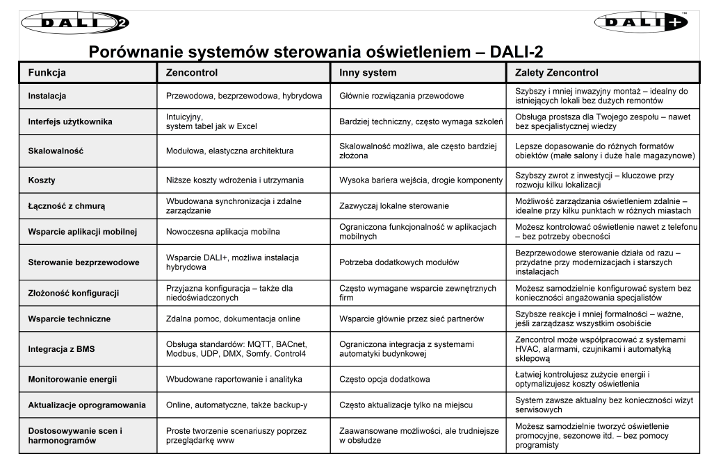 System Dali to popularny system sterowania oświetleniem, który oferuje zaawansowane funkcje zarządzania i integracji z różnymi systemami oświetleniowymi i dobrą alternatywa dla wielu firm które oferują takie rozwiązanie jest ZC-Controller, który jest w takim samym stopniu funkcjonalny i jako jedyny system na rynku Polskim pozwala na dokonywanie zmian zdalnie.