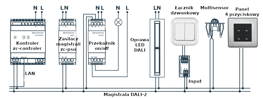 - Jedna magistrala DALI-2 do 64 urządzeń plus 63 urządzenia sterujące
