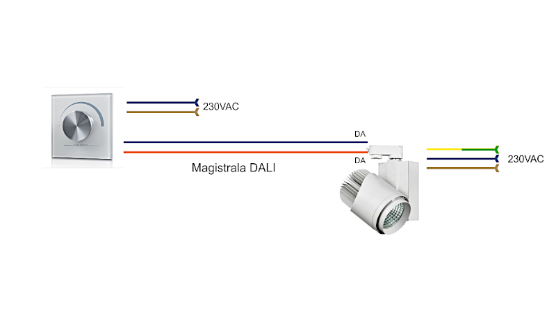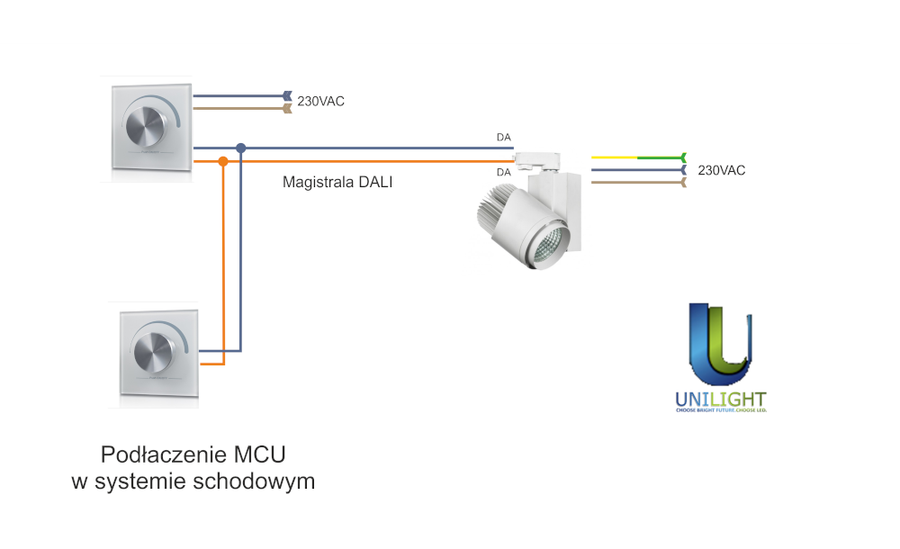 - Działa w trybie broadcast - kontroluje wszystkie urządzenia w magistrali DALI