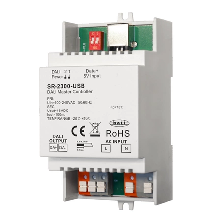 Kontroler główny DALI na szynę DIN SR-2300-USB jest centralnym kontrolerem systemu DALI, który służy do sterowania urządzeniami sterującymi DALI oraz konfigurowania urządzeń wejściowych DALI-2 na linii DALI. Każdy kanał DALI umożliwia automatyczne przypisywanie i zarządzanie adresami dla maksymalnie 64 urządzeń sterujących, które można przypisać do maksymalnie 16 grup. Kontroler DALI-2 obsługuje 5 typów urządzeń sterujących DALI: DT6, DT8 Tc, DT8 XY, DT8 RGBWA oraz DT7 aktuator przełączający. Każdy kanał DALI obsługuje również wszystkie typy urządzeń wejściowych DALI-2, w tym przyciski, czujniki ruchu, czujniki światła, przełączniki obrotowe oraz panele dotykowe. Każdy kanał DALI może obsługiwać do 64 urządzeń wejściowych DALI-2, które można przypisać do maksymalnie 32 grup. Każdy kanał DALI umożliwia utworzenie do 16 scen DALI. Umożliwia utworzenie do 256 zadań czasowych. Umożliwia ustawienie do 4 typów harmonogramów wygaszania jasności i cykli wygaszania kolorów. Umożliwia ustawienie do 4 harmonogramów temperatury barwowej Bionic dla urządzeń sterujących CCT, aby naśladować zmiany naturalnego światła w ciągu 24 godzin (oświetlenie ukierunkowane na człowieka). Został zaprojektowany z wykorzystaniem narzędzia konfiguracyjnego na komputerze PC, co umożliwia konfigurację i odczytywanie parametrów panelu DALI oraz urządzeń sterujących, a także zarządzanie panelem kontrolnym i urządzeniami sterującymi.