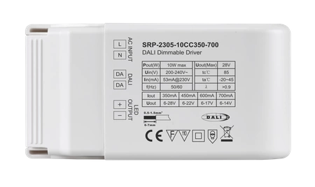 Zasilacz LED 10W DALI DT6 jest zgodny z normami IEC 62386-101:2014, IEC 62386-102:2014, IEC 62386-207 ed. 2 i jest kompatybilny z uniwersalnymi urządzeniami nadrzędnymi DALI, które obsługują komendy DT6. Dzięki wbudowanemu interfejsowi DALI-2/Push, to urządzenie DALI DT6 zapewnia wysoki współczynnik mocy i sprawność. Ten ściemnialny zasilacz ma maksymalną moc wyjściową 10 W. Posiada jeden kanał o stałym prądzie 350~700 mA, wybierany za pomocą przełącznika DIP. Zasilacz klasy II i całkowicie izolowana plastikowa obudowa umożliwiają włączanie i ściemnianie opraw oświetleniowych LED. Oferuje hybrydowe ściemnianie (PWM+CCR) oraz gładkie i głębokie ściemnianie do 0,1%. Ponadto posiada funkcję raportowania błędów. Klasa ochrony IP20 sprawia, że jest odpowiedni do wewnętrznych zastosowań oświetleniowych LED, a także objęty jest 5-letnią gwarancją.