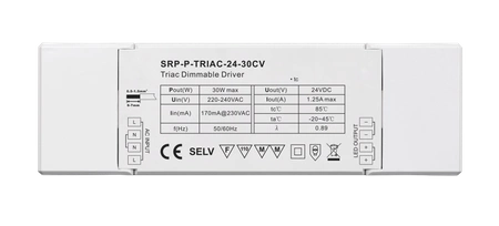 SRP-TRIAC-24-30CV to zatwierdzony przez ENEC 30W ściemnialny zasilacz LED z triakiem, z 1 kanałem wyjściowym o stałym napięciu 24VDC. Został zaprojektowany z wejściem 220-240VAC. Zasilacz z triakiem jest wyposażony w 4 interfejsy ściemniania: DALI, Push, Triac, 0/1-10V w jednym, co umożliwia współpracę z różnymi systemami sterowania. Zasilacz LED stosuje wyjście ściemniania amplitudowego zamiast wyjścia PWM, aby zapewnić prawdziwe działanie bez migotania. Umożliwia płynne i głębokie ściemnianie do 1% bez migotania i hałasu. 1 adres DALI może być automatycznie przypisany przez master DALI. Zgodny z IEC 62386-101, IEC 62386-102, IEC 62386-207, ten zasilacz DALI jest kompatybilny z większością systemów DALI dostępnych na rynku. Zasilacz z triakiem może być kompatybilny z uniwersalnymi ściemniaczami triakowymi. W przypadku wyboru interfejsu 0/1-10V, jest kompatybilny z uniwersalnymi ściemniaczami 0/1-10V.