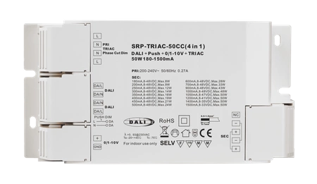 SRP-TRIAC-50CC to zatwierdzony przez ENEC 50W ściemnialny sterownik LED z triakiem, który posiada 1 kanał wyjścia o stałym prądzie oraz regulowany prąd od 180mA do 1500mA za pomocą przełączników DIP, co pozwala na jego dopasowanie do różnych lamp LED. Zaprojektowany jest z wejściem 220-240VAC. Sterownik ściemniania z triakiem wyposażony jest w 4 interfejsy ściemniania w 1: DALI, Push, Triac, 0/1-10V, co umożliwia mu współpracę z różnymi systemami sterującymi. Sterownik LED wykorzystuje wyjście ściemniania amplitudowego zamiast wyjścia PWM, aby zapewnić całkowity brak migotania. Współczynnik mocy sterownika może przekraczać 0,9, a wydajność jest wyższa niż 87%. Umożliwia gładkie i głębokie ściemnianie do 1% bez migotania i szumów. 1 adres DALI może być automatycznie przypisany przez mastera DALI. Zgodny z normami IEC 62386-101, IEC 62386-102, IEC 62386-207, ten sterownik DALI jest kompatybilny z większością systemów DALI dostępnych na rynku. Sterownik ściemniania z triakiem może być kompatybilny z uniwersalnymi ściemniaczami triakowymi. Przy wyborze interfejsu 0/1-10V, jest kompatybilny z uniwersalnymi ściemniaczami 0/1-10V.