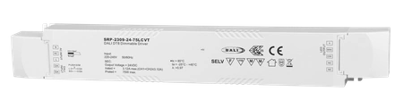 SRP-2309-24-75LCVT to certyfikowany przez DALI-2 sterownik LED o mocy 75W z 2 równolegle połączonymi kanałami i stałym napięciem wyjściowym 24VDC. Zaprojektowany jest z uniwersalnym zasilaniem 220-240VAC. Współczynnik mocy tego sterownika może przekraczać 0,9, a efektywność jest wyższa niż 90%. Umożliwia płynne i głębokie przyciemnianie do 0,1%, bez migania i szmerów. 1 adres DALI można przypisać ręcznie za pomocą przycisków i wyświetlić na wyświetlaczu cyfrowym lub automatycznie przypisać przez masterów DALI. Zgodny z normami IEC62386-101:2014, 102:2014, 207 ed.2, ten sterownik DALI jest kompatybilny z certyfikowanymi aplikacjami i urządzeniami sterującymi do zastosowań DALI-2. Certyfikaty UL i ENEC zapewniają wysoki poziom bezpieczeństwa i niezawodności tego sterownika w wykorzystaniu na całym świecie.