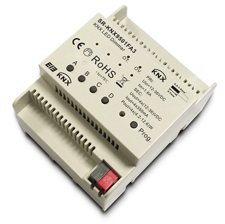Ściemniacz KNX SR-KNX9501FA jest łatwym do podłączenia kontrolerem ściemniania stałonapięciowego z 4 kanałami 5 A 12-36V na kanał, który jest kompatybilny z systemem KNX.
