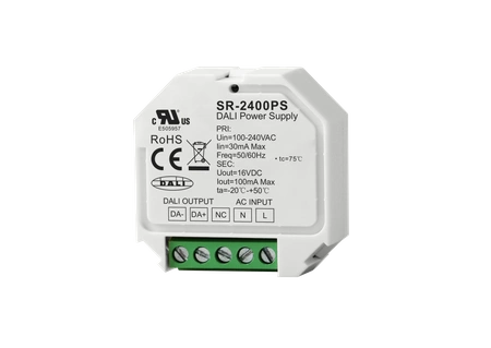 SR-2400PS to uniwersalny zasilacz DALI zaprojektowany w kompaktowym rozmiarze i szerokim zakresie napięcia wejściowego 100-240VAC, z prądem wyjściowym 250mA do zasilania magistrali DALI. Zasilacz DALI charakteryzuje się wysoką niezawodnością i stabilnością oraz zabezpieczeniem przed przeciążeniem.
