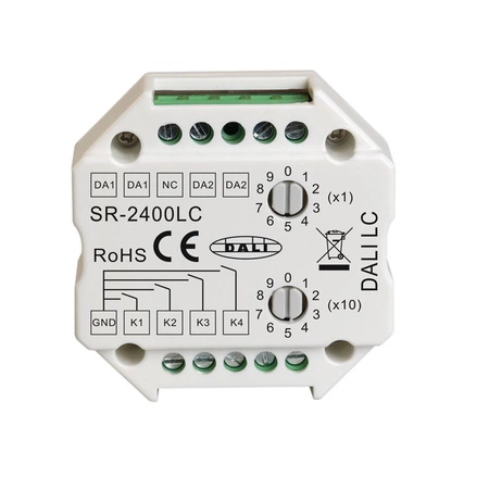 Moduł Mistrza DALI SR-2400LC to kompaktowy ściemniacz DALI, który kontroluje 4 adresy DALI dla 4 pojedynczych źródeł światła na linii DALI. Powinien być sterowany przez zewnętrzny przełącznik, co zapewnia precyzyjne i szybkie funkcje włączania oraz ściemniania bez migotania. Przełącznik ściemniacza jest zgodny z standardowym protokołem DALI i może być kompatybilny z produktami DALI innych międzynarodowych korporacji. Moduł DALI potrafi wykrywać magistralę DALI z zainstalowanymi wieloma kontrolerami ściemniania w każdej linii magistrali DALI. Umożliwia on wybór różnych adresów DALI z łącznej liczby 64 adresów za pomocą przełączników obrotowych z tyłu do sterowania. Można wybrać do 4 pojedynczych adresów DALI do kontroli włączania i ściemniania. Przełącznik ściemniacza można łatwo umieścić w skrzynce o wymiarach 86*86 mm.