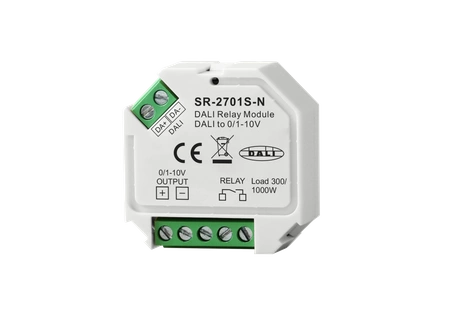 SR-2701S-N to moduł przekaźnikowy DALI oraz konwerter DALI na 0/1-10V, który jest zdolny do przełączania zarówno obciążeń AC, jak i DC oraz do kontrolowania 0/1-10V obciążeń ściemnianych. Maksymalne napięcie przełączania dla obciążeń AC wynosi 250V, a maksymalne napięcie przełączania dla obciążeń DC to 30V. Moduł DALI RM umożliwia integrację istniejących obciążeń, które nie mają wejścia DALI, w obwód DALI oraz włączanie/wyłączanie tych obciążeń. Konwerter DALI na 0/1-10V umożliwia integrację 0/1-10V obciążeń ściemnianych w obwód DALI i kontrolowanie obciążeń za pośrednictwem DALI.