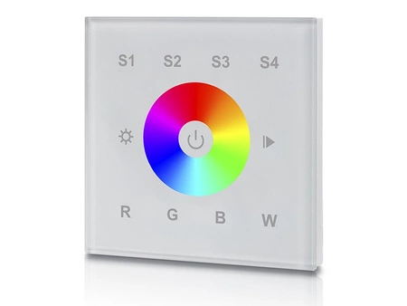 SR-2300TR-RGBW to dotykowy kontroler RGBW DALI, który wykorzystuje wysokiej wytrzymałości, ultra czuły panel ze szkła hartowanego z designem dotykowego koła kolorów, aby zapewnić dokładne i szybkie dostosowanie tonacji kolorów oraz jasności dla oświetlenia LED RGB+W.