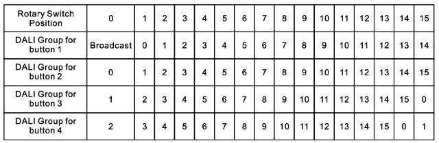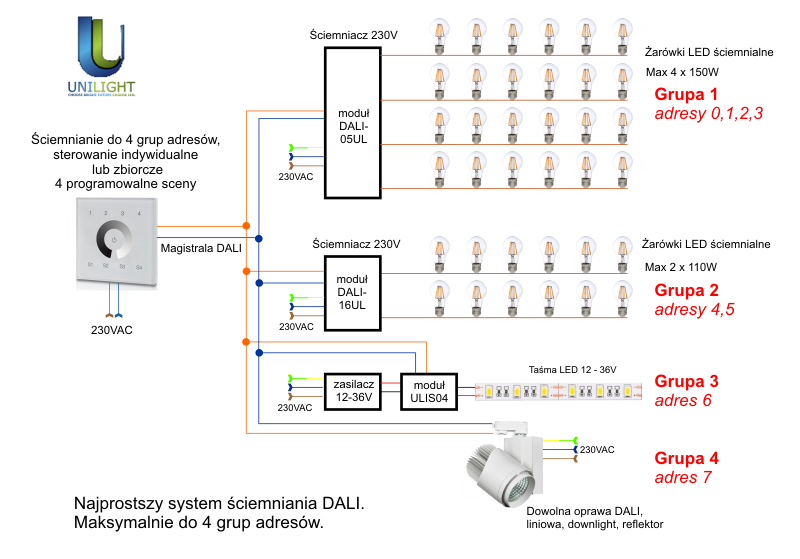 - sterowanie czterema grupami adresów indywidualnie lub łącznie, także broadcast- oprawy DALI powinny być wcześniej zaadresowane i pogrupowane w odpowiedniej kolejności