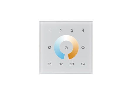 Mistrz DALI SR-2300TR-G4-CCT-EU to dotykowy kontroler DALI DT8, który wykorzystuje wysokiej wytrzymałości, ultra czuły panel ze szkła hartowanego, aby zapewnić dokładne i szybkie dostosowanie temperatury barwowej oraz jasności w celu sterowania diodami LED o podwójnej barwie. Kontroler LED spełnia normy IEC 62386-102, IEC 62386-207, IEC 62386-209 i może być kompatybilny z produktami DALI innych międzynarodowych korporacji. Dotykowe koło kolorów umożliwia płynne i precyzyjne dostosowanie temperatury barwowej. Mistrz DALI może kontrolować 4 grupy DALI (wersja UE) oraz 4 sceny DALI (wersja UE). Umożliwia ustawienie numeru początkowej grupy DALI (łącznie 16 grup od 0 do 14) oraz numeru sceny DALI (łącznie 16 scen od 0 do 14) za pomocą przełączników obrotowych z tyłu. Ponadto kontroluje wszystkie urządzenia na linii DALI poprzez rozgłos. Zasilany jest przez magistralę DALI, więc nie wymaga dodatkowego zasilania. Dostępne są wersje europejska i amerykańska, które łatwo można zainstalować w istniejącej standardowej puszce ściennej.