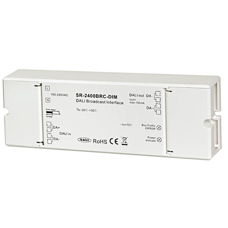 SR-2400BRC to moduł transmisji DALI dla systemów DALI DT6 i DT8, który może być używany do rozszerzenia obwodu DALI. Moduł ten odbiera polecenia DT6 i DT8 z głównego obwodu DALI jako urządzenie sterujące z pojedynczym adresem i przekazuje odebrane polecenia DALI do wszystkich urządzeń sterujących podłączonych do wyjścia DALI OUT. Wszystkie urządzenia sterujące podłączone do DALI OUT będą kontrolowane przez przekazywane polecenia DALI. Wszystkie urządzenia podłączone do DALI OUT będą kontrolowane za pośrednictwem adresu DALI modułu. Moduł został zaprojektowany z wyjściem zasilania DALI (150 mA), aby zasilać maks. 64 urządzenia sterujące. Nie jest wymagane adresowanie DALI dla urządzeń sterujących podłączonych do DALI OUT. Moduł transmisji znacznie redukuje czas i koszty uruchamiania oraz upraszcza konserwację. Wiele modułów można podłączyć do głównego obwodu DALI, aby utworzyć wiele podrzędnych obwodów DALI, co znacznie zwiększa liczbę urządzeń sterujących w głównym obwodzie DALI.