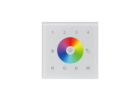 Moduł kontrolera DALI SR-2300TR-G4-RGBW to dotykowy kontroler RGBW DALI, który wykorzystuje panel szklany o wysokiej wytrzymałości i ultra czułości, zaprojektowany w formie koła kolorów dotykowego, aby umożliwić precyzyjne i szybkie dostosowywanie tonacji kolorów oraz jasności dla oświetlenia LED RGB+W. Kontroler RGBW jest zgodny z normami IEC 62386-102, IEC 62386-207, IEC 62386-209 i może być kompatybilny z produktami DALI innych międzynarodowych korporacji. W wersji DT8 każda strefa świetlna z czterech może kontrolować 1 grupę DALI. Przełącznik z tyłu umożliwia ustawienie początkowego numeru grupy DALI lub broadcast. Wiele kontrolerów można zainstalować w jednej magistrali DALI.