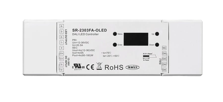 SR-2303FA-OLED to pierwszy na świecie ściemniacz DALI certyfikowany DT6 z wbudowaną funkcją głównego kontrolera DALI oraz wyświetlaczem OLED do łatwej konfiguracji manualnej. Ściemniacz LED został zaprojektowany z 4 wyjściami PWM, które można adresować i grupować indywidualnie lub razem. Umożliwia to zdefiniowanie i przywołanie łącznie 16 scen DALI dla 4 wyjść, zarówno indywidualnie, jak i razem. Krzywa ściemniania logarytmicznego/liniowego może być ustawiana w celu dopasowania do wrażliwości ludzkiego oka. Częstotliwość wyjścia PWM można ustawić w zakresie od 250 Hz do 30 kHz, co zapewnia wyjątkowo płynne ściemnianie do 0,1% w przypadku specyficznych zastosowań.
