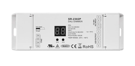 Ściemniacz DALI SR-2302P to kontroler ściemniania o stałym napięciu z 4 kanałami, o maksymalnym prądzie 5A na kanał, który spełnia standardowy protokół DALI z 1 adresem DALI do jednoczesnego sterowania 4 kanałami. Ściemniacz DALI został zaprojektowany z nowo zaktualizowaną obudową, która wyposażona jest w terminale do łatwego połączenia bez użycia śrub, co zapewnia szybkie i proste podłączenie. Adres DALI można przypisać ręcznie i wyświetlić na cyfrowym wyświetlaczu lub automatycznie przypisać przez kontrolery główne. 1 adres DALI jest dostępny dla 4 kanałów, które mogą działać jednocześnie. Płynne ściemnianie w zakresie od 0% do 100% może być osiągnięte przez ściemniacz DALI dzięki charakterystyce logarytmicznej, co jest idealne dla ludzkiego wzroku. Ściemniacz DALI jest kompatybilny z SR-2400TL, SR-2400TG, SR-2400TS, SR-2400LC, SR-2400GC, SR-2400SC oraz innymi wysokiej jakości kontrolerami DALI.