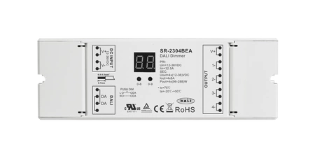 Ściemniacz DALI SR-2304BEA to kontroler ściemniania o stałym napięciu z 4 kanałami, o maksymalnym prądzie 8A na kanał, który spełnia standardowy protokół DALI z 1 adresem DALI do jednoczesnego sterowania 4 kanałami. Adres DALI można przypisać ręcznie i wyświetlić na cyfrowym wyświetlaczu lub automatycznie przypisać przez kontrolery główne. Możliwe jest skonfigurowanie 1-4 adresów DALI dla 4 kanałów, aby działały jednocześnie lub oddzielnie. Ściemniacz DALI umożliwia płynne ściemnianie w zakresie od 0,1% do 100% dzięki charakterystyce logarytmicznej, co jest idealne dla ludzkiego wzroku. Ściemniacz DALI jest kompatybilny nie tylko z kontrolerami głównymi DALI, ale również z przełącznikami przyciskowymi, co umożliwia uzyskanie funkcji ściemniania i przełączania w sytuacjach bez sygnału DALI.