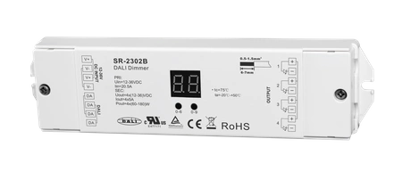Dimmers DALI SR-2302B to kontroler przyciemniający z stałym napięciem, który ma 4 kanały i wyjście 5A na kanał. Zgodny z protokołem DALI, posiada 1 adres DALI do synchronizacji kontroli 4 kanałów. Adres DALI można przypisać ręcznie i wyświetlić na cyfrowym wyświetlaczu, lub przypisać automatycznie przez kontrolery główne. 1 adres DALI jest dostępny dla 4 kanałów do pracy w synchronizacji. Przy pomocy ściemniacza DALI można uzyskać płynne przyciemnianie w zakresie 0%-100% dzięki charakterystyce logarytmicznej, co jest idealne dla ludzkiego wzroku.