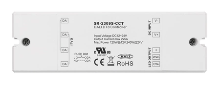 Ten ściemniacz LED DALI DT8 o stałym napięciu i podwójnym kolorze jest urządzeniem certyfikowanym DALI-2, CE oraz FC, z wbudowanym interfejsem DALI-2. Urządzenie spełnia normy IEC 62386-101:2014, IEC 62386-102:2014, IEC 62386-207 Ed2, IEC 62386-209:2011, umożliwia regulację ściemniania oraz temperatury barwowej, a także kontrolę wyjścia ciepłej bieli i zimnej bieli za pomocą jednego adresu DALI. Może być również konfigurowane za pośrednictwem interfejsu USB głównego kontrolera DALI. Posiada dwa kanały wyjściowe o stałym napięciu z maksymalnym prądem 5A na kanał; ten ściemniacz obsługuje komendy urządzeń DT8 i jest kompatybilny z głównymi kontrolerami DALI, które obsługują komendy DT8.
