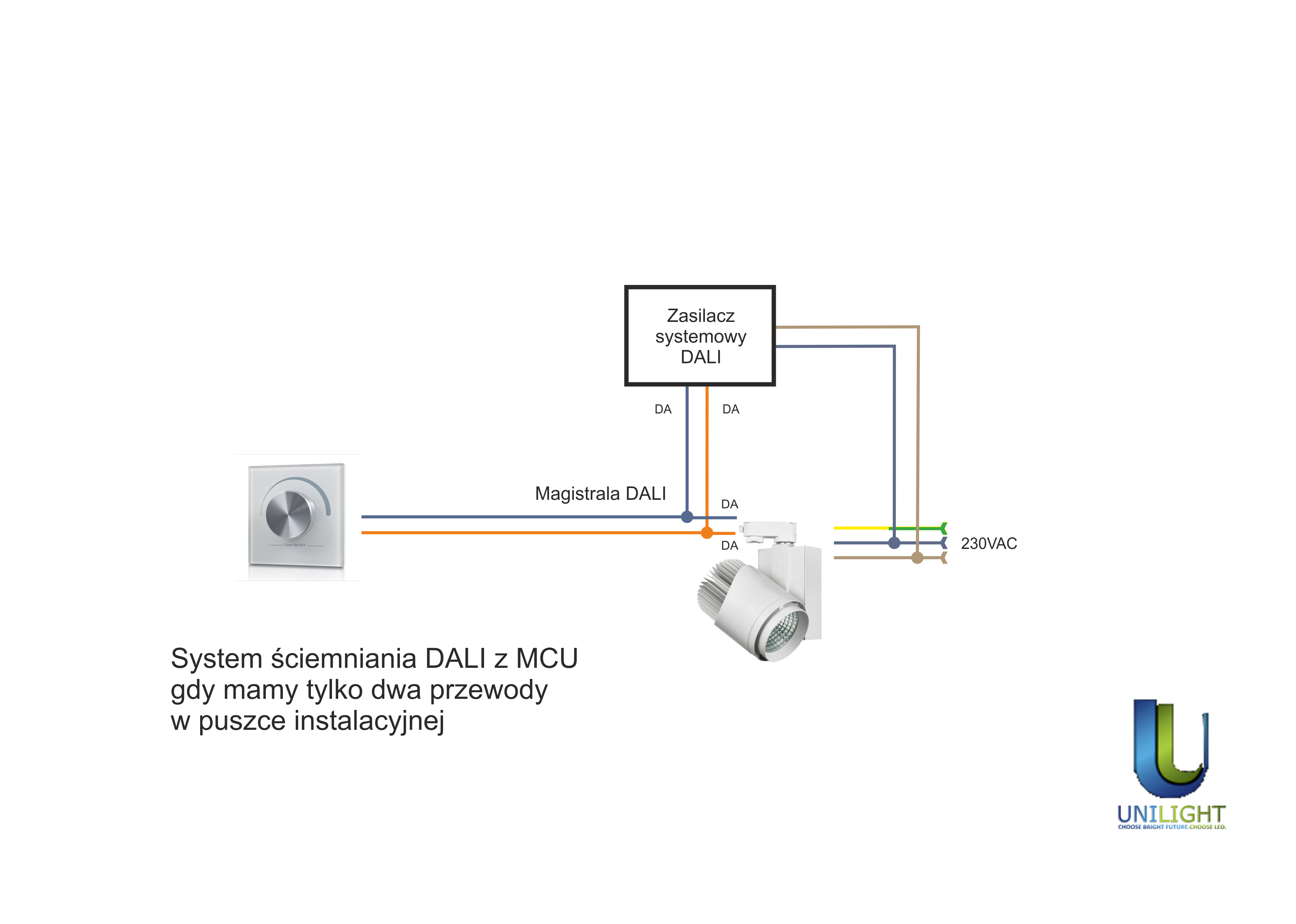 - Działa w trybie broadcast - kontroluje wszystkie urządzenia w magistrali DALI