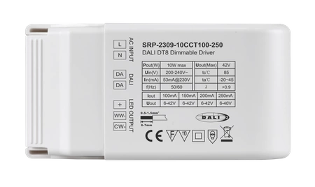 SRP-2309-10CCT100-250 to ściemnialny sterownik LED, a maksymalna moc wyjściowa wynosi 10W.