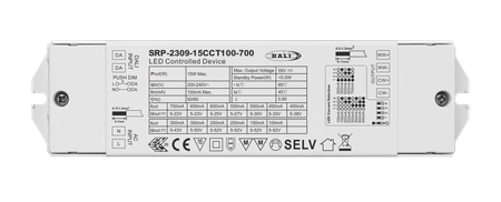 SRP-2309-15CCT100-700 to ściemnialny sterownik LED, a maksymalna moc wyjściowa wynosi 15W.