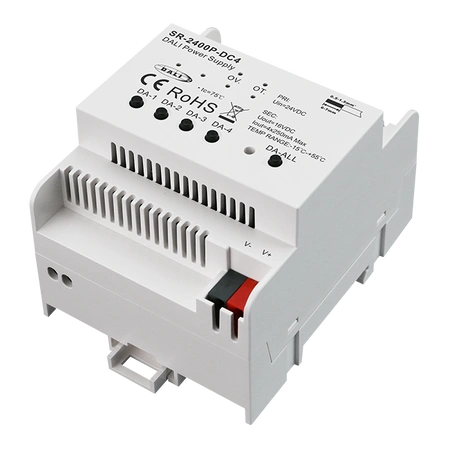 SR-2400P-DC4 to uniwersalny zasilacz DALI zaprojektowany do pracy z napięciem wejściowym 24 V DC, wyposażony w 4 wyjścia po 250 mA, przeznaczone do zasilania magistrali DALI. Zasilacz charakteryzuje się wysoką niezawodnością i stabilnością pracy oraz posiada zabezpieczenie nadprądowe.