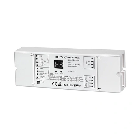 SR-2303 (0–10V / PWM) to sterownik LED 0–10V, który odbiera sygnał DALI i konwertuje go na sygnał 0–10V / PWM w celu ściemniania oraz włączania/wyłączania jednokolorowego oświetlenia LED. Adres DALI może być przypisany ręcznie i wyświetlany na numerycznym wyświetlaczu cyfrowym lub nadawany automatycznie przez kontroler nadrzędny. Sterownik 0–10V jest kompatybilny z szeroką gamą sterowników nadrzędnych DALI.