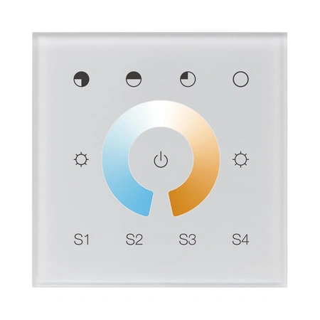 Sterownik nadrzędny DALI SR-2300TR-CCT to dotykowy kontroler DALI DT8, wyposażony w wytrzymały i bardzo czuły panel ze szkła hartowanego, który zapewnia precyzyjną i szybką regulację temperatury barwowej oraz jasności do sterowania dwukolorowymi diodami LED. Urządzenie jest zgodne z normami IEC 62386-102, IEC 62386-207 oraz IEC 62386-209 i kompatybilne z produktami DALI innych międzynarodowych producentów. Dotykowe koło barw umożliwia płynną i precyzyjną regulację temperatury barwowej.