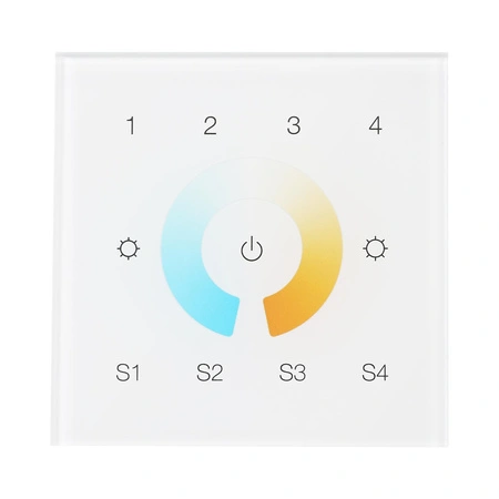 Sterownik nadrzędny DALI SR-2300TR-G4-CCT-EU to dotykowy kontroler DALI DT8, wyposażony w wytrzymały i bardzo czuły panel ze szkła hartowanego, który zapewnia precyzyjną i szybką regulację temperatury barwowej oraz jasności do sterowania dwukolorowymi diodami LED. Urządzenie jest zgodne z normami IEC 62386-102, IEC 62386-207 oraz IEC 62386-209 i kompatybilne z produktami DALI innych międzynarodowych producentów. Dotykowe koło barw umożliwia płynną i precyzyjną regulację temperatury barwowej.