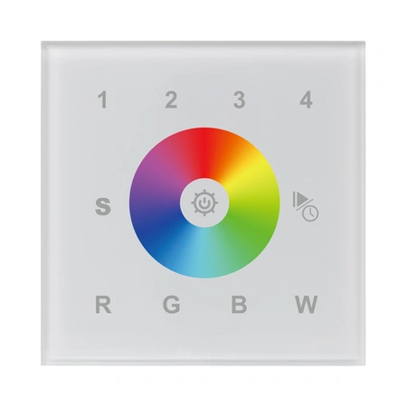 Sterownik nadrzędny DALI SR-2300TR-G4-RGBW to dotykowy kontroler RGBW DALI, wyposażony w wytrzymały i bardzo czuły panel ze szkła hartowanego z dotykowym kołem kolorów, który zapewnia precyzyjną i szybką regulację barwy światła oraz jasności dla oświetlenia LED RGB+W. Urządzenie jest zgodne z normami IEC 62386-102, IEC 62386-207 oraz IEC 62386-209 i kompatybilne z produktami DALI innych międzynarodowych producentów. Sterownik DALI umożliwia sterowanie do 4 stref oświetleniowych (wersja EU).