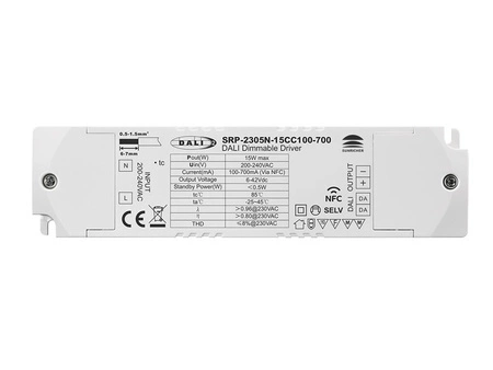 Ten programowalny zasilacz LED DALI DT6 o mocy 15W z funkcją NFC. Posiada certyfikat DALI-2 i spełnia normy IEC 62386-101:2014, IEC 62386-102:2014, IEC 62386-207 Ed2. Jest kompatybilny z uniwersalnymi masterami DALI, które obsługują komendy DT6. Zasilacz można programować za pomocą aplikacji lub narzędzia do programowania NFC. Prąd wyjściowy można konfigurować w krokach co 0,1 mA w zakresie 100-700 mA, co zapewnia wysoką dokładność prądu i pomaga w redukcji zapasów. Konfiguracje DALI, takie jak adresowanie, grupowanie, ustawianie scen, poziom zasilania, poziom awarii systemu, czas zanikania, wskaźnik zanikania itp., można również ustawić za pomocą NFC.