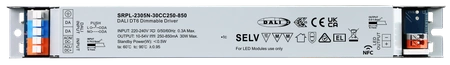 SRPL-2305N-30CC250-850 to certyfikowany zasilacz LED DALI-2 w długiej metalowej obudowie o mocy 30W z możliwością ściemniania. Jest zaprojektowany z jednokanałowym wyjściem prądowym o regulowanym zakresie od 250mA do 850mA, co umożliwia jego zastosowanie w lampach LED o różnych wartościach prądu. Jest przeznaczony do zasilania o napięciu AC 220-240V. Współczynnik mocy zasilacza może wynosić powyżej 0,97, a sprawność jest wyższa niż 87%. Umożliwia płynne i głębokie ściemnianie do 0,1% bez migotania. 1 adres DALI można ręcznie przypisać za pomocą przycisków, co jest wyświetlane na wyświetlaczu cyfrowym, lub automatycznie przez urządzenia nadrzędne DALI. Zgodny z normami IEC62386-101:2014, 102:2014, 207 ed.2, i jest kompatybilny z aplikacjami sterującymi i urządzeniami sterującymi z certyfikatem DALI-2.