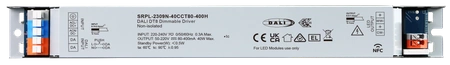 SRPL-2309N-40CCT80-400H to zasilacz LED, w długiej metalowej obudowie o mocy 40W, z certyfikatem DALI-2 DT8, Non-SELV, z możliwością ściemniania za pomocą NFC. Jest zaprojektowany z dwukanałowym wyjściem prądowym o regulowanym zakresie od 80mA do 400mA, co sprawia, że jest odpowiedni dla lamp LED o różnych prądach. Posiada wejście AC 220-240V. Współczynnik mocy zasilacza może wynosić ponad 0,97, a jego sprawność jest wyższa niż 87%. Umożliwia płynne i głębokie ściemnianie do 0,1% bez migotania. 1 adres DALI można przypisać ręcznie za pomocą przycisków i wyświetlić na wyświetlaczu cyfrowym lub przypisać automatycznie przez masterów DALI. Zgodny z IEC62386-101:2014, 102:2014, 207 ed.2, i jest kompatybilny z kontrolerami aplikacji i urządzeniami kontrolnymi certyfikowanymi zgodnie z DALI-2.