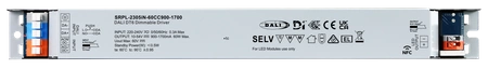 SRPL-2305iN-60CC900-1700 to zasilacz LED w długiej metalowej obudowie o mocy 60W, posiadający certyfikat D4i. Jest zaprojektowany z jednokanałowym wyjściem prądowym o regulowanym zakresie od 900 mA do 1700 mA, co sprawia, że jest odpowiedni dla lamp LED o różnych wartościach prądu. Posiada wejście AC 220-240V. Współczynnik mocy tego zasilacza może wynosić powyżej 0,98, a sprawność jest wyższa niż 87%. Umożliwia płynne i głębokie ściemnianie do 0,1% bez migotania. 1 adres DALI można ręcznie przypisać za pomocą przycisków, co jest wyświetlane na wyświetlaczu cyfrowym, lub automatycznie przez urządzenia nadrzędne DALI. Zgodny z normami IEC62386-101:2014, 102:2014, 207 ed.2,i jest kompatybilny z aplikacjami sterującymi i urządzeniami sterującymi z certyfikatem DALI-2.