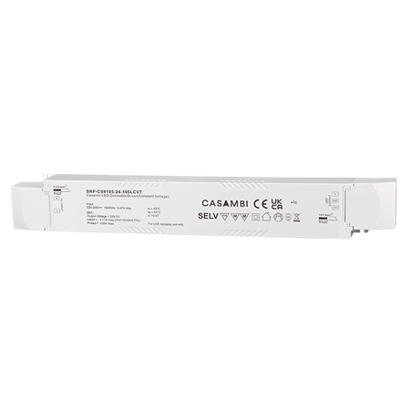 SRP-CS9105-24-100LCVT to wysokowydajny ściemnialny sterownik LED o mocy 100W, z technologią Bluetooth Casambi, z dwoma kanałami wyjściowymi. Oferuje wyjście stałego napięcia 24VDC przy zasilaniu 220-240VAC, co zapewnia współczynnik mocy większy niż 0,97 oraz wydajność przekraczającą 93%. Dzięki zaawansowanej technologii Casambi, sterownik umożliwia płynne, wolne od migotania ściemnianie do 0,01% bez jakichkolwiek dźwięków buczenia. Jest wyposażony w aktywną korekcję współczynnika mocy (PFC), ochronę przed przegrzaniem, przeciążeniem i przepięciem, co czyni go trwałym i bezpiecznym rozwiązaniem dla aplikacji oświetlenia LED.
