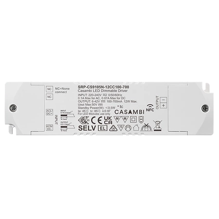 SRP-CS9105N-12CC100-700 to sterownik LED o mocy 12W z obudową z tworzywa sztucznego, programowalny za pomocą Bluetooth NFC, wykorzystujący technologię Casambi. Jest zaprojektowany z jedną stałą linią prądową o regulowanym prądzie od 100mA do 700mA, co sprawia, że jest odpowiedni do lamp LED o różnym prądzie. Obsługuje zasilanie 220-240VAC z wysokim współczynnikiem mocy i wydajnością. Umożliwia płynne i głębokie ściemnianie do 0,01% bez migotania i hałasu.