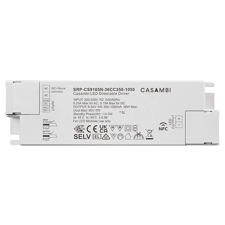 SRP-CS9105N-36CC350-1050 to sterownik LED o mocy 36W z obudową z tworzywa sztucznego, programowalny za pomocą Bluetooth NFC, wykorzystujący technologię Casambi. Jest zaprojektowany z jedną stałą linią prądową o regulowanym prądzie od 350mA do 1050mA, co sprawia, że jest odpowiedni do lamp LED o różnym prądzie. Obsługuje zasilanie 220-240VAC z wysokim współczynnikiem mocy i wydajnością. Umożliwia płynne i głębokie ściemnianie do 0,01% bez migotania i hałasu.