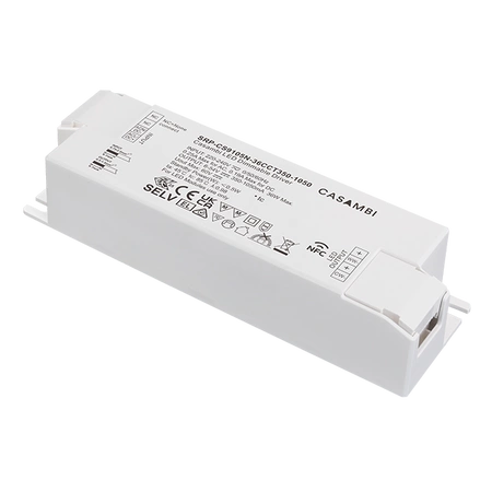 SRP-CS9105N-36CCT350-1050 to sterownik LED o mocy 36W z obudową z tworzywa sztucznego, programowalny za pomocą Bluetooth NFC, wykorzystujący technologię Casambi. Został zaprojektowany z dwoma kanałami wyjściowymi prądu stałego o regulowanym prądzie od 350mA do 1050mA, co sprawia, że nadaje się do lamp LED o różnym prądzie. Obsługuje zasilanie 220-240VAC z wysokim współczynnikiem mocy i wydajnością. Umożliwia płynne i głębokie ściemnianie do 0,01% bez migotania i hałasu.