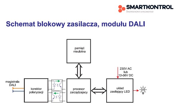 Magistrala DALI poprzez specjalny układ, który koryguje polaryzację i oddziela galwanicznie, wprowadza sygnał cyfrowy do procesora. Ramki DALI są dzielone na bajty w którym pierwszy odpowiada za adres. Adres jest porównywany w procesorze i gdy odpowiada adresowi urządzenia zawartemu w pamięci zasilacza układ wykonuje polecenie zawarte w drugim i kolejnym bajcie, czyli włącza, wyłącza, ściemnia lub rozjaśnia odbiorniki podłączone do układu zasilającego. Automatyczny system korygujący polaryzację zwalnia nas z uważnego podłączania magistrali co jest tak ważne np. w przypadku KNX. Transoptor pomiędzy magistralą a zasilaczem oddziela galwanicznie system DALI od potencjalnego przebicia 230V zapewniając maksymalne bezpieczeństwo.